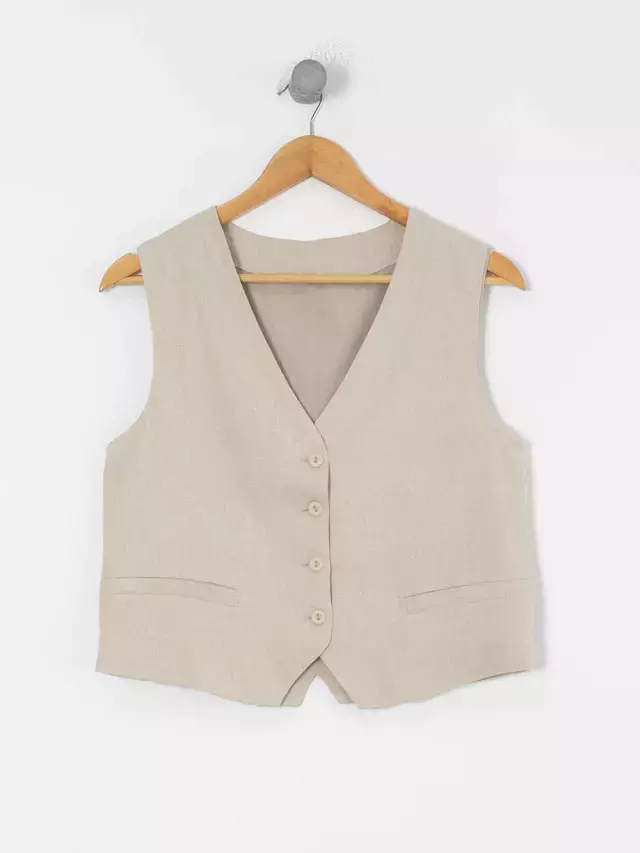 Chaleco sastrero con bolsillos falsos delanteros, cuatro botones a tono. Pinzas delanteras y en la espalda.